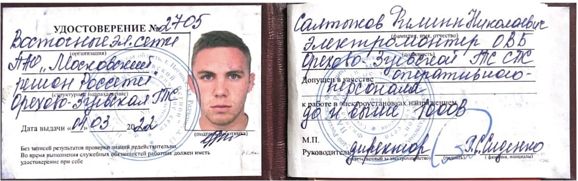 Салтыков Филипп Николаевич. Электромонтажник 6 разряда, 4 группа электробезопасности.